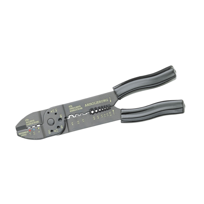 Цей універсальний інструмент призначений для створення надійних безпаяних електричних з’єднань відповідно до стандарту DIN. Кліщі поєднують у собі кілька функцій: зняття ізоляції, різання дроту, обтискання ізольованих та неізольованих кабельних наконечників і штекерних з’єднань. Завдяки спеціальним різьбовим отворам можна легко обрізати мідні та латунні гвинти.